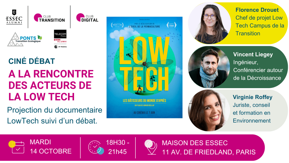 Le Club ESSEC Transition Alumni, le Club Digital & Technology, le Groupe Transition Écologique des Ponts, et Telecom Paris avec le support d'Alumni ACT, vous invitent à participer à un Ciné Débat autour de la projection d'un documentaire sur la démarche Low Tech.